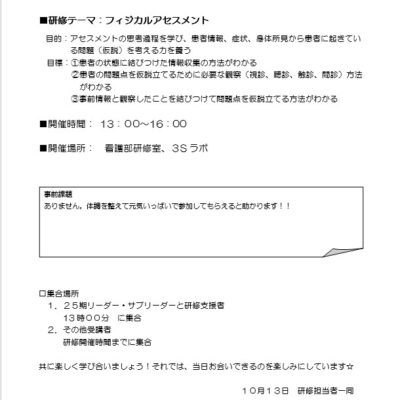 ◆お知らせ◆ジェネラリスト育成計画~ビギナーズ 12月研修~ 2024.11.27 研修 12月2日に開催される半日研修のお知らせです。12月の研修は 『腹部大動脈瘤の看護』です。 詳細はポスターをご確認ください 。 研修 ER/OR既卒看護師~仕事と子育ての両立~前の記事 ER/OR 4年目看護師~自己啓発について~次の記事