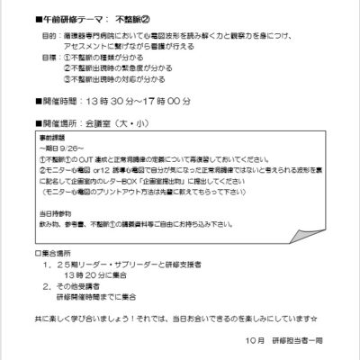 ◆お知らせ◆ジェネラリスト育成計画~ビギナーズ 10月研修 2025.10.1 研修 10月6日に開催される半日研修のお知らせです。10月の研修は 『不整脈②』です。 詳細はポスターをご確認ください 。 研修 4階病棟1年目看護師~日々奮闘しています~前の記事 心臓センター1年目看護師~心臓センター配属となって~次の記事