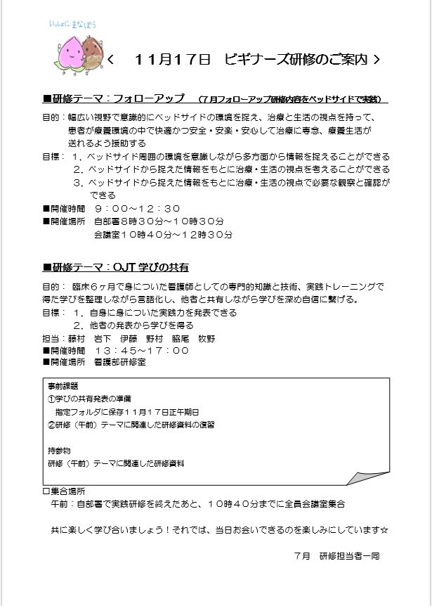 ◆お知らせ◆ジェネラリスト育成計画~ビギナーズ 11月研修 2025.11.12 研修 11月17日に開催される1日研修のお知らせです。11月の研修は 『フォローアップ』『OJT学びの共有』です。 詳細はポスターをご確認ください 。 研修 ICU6年目看護師~学会発表 決意から気づき~前の記事