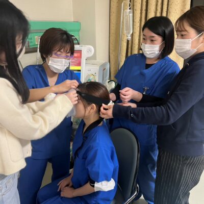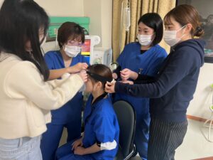 体験し合いながら「こんな風くるんや・・」「患者さんこの風だと苦しいね」「目に風が当たると痛い・・・」など、色々感想を言い合いながら経験を積むことができました。