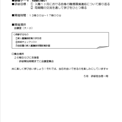 ◆お知らせ◆ジェネラリスト育成計画~ビギナーズ 4月研修 2026.04.22 研修 4月29日に開催される半日研修のお知らせです。4月の研修は 『同期の集い』です。 詳細はポスターをご確認ください 。 研修 ◆お知らせ◆ジェネラリスト育成計画~ビギナーズ 4月研修前の記事