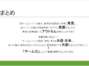 症例を選び、自分達で看護を振り返ると、実はこれも看護だった、この関わりはこんな効果があったのか、など色んな視点から様々な看護が見えてきました。